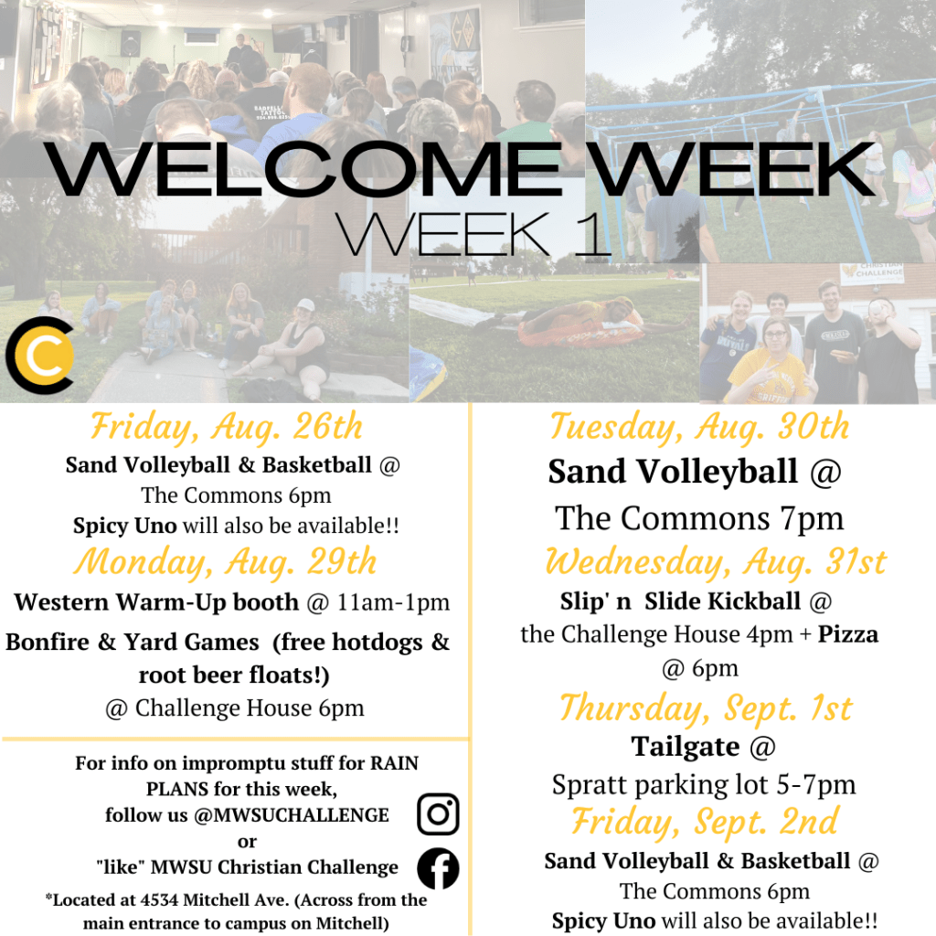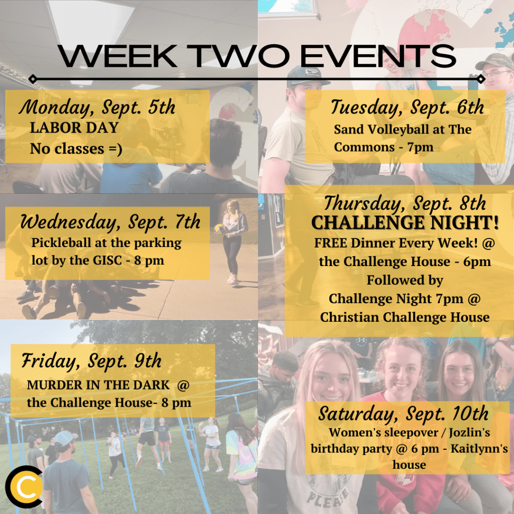We’re super excited to begin this new semester! It’s so fun to connect with old friends and make new ones, and we have a lot of opportunities coming up to give us ample time to do just that! Our first Challenge Night on a Thursday won’t be until the second week of class (September 8th), but until then, there’s SO MUCH GOING ON! Don’t miss out! Come and bring a friend! Follow us on social media for the most up-to-date info.